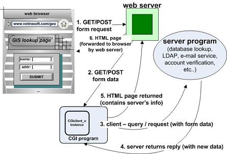 A class object for making a CGI program. This object is designed to be a singleton instance within a program, and it can work in conjuction with a separate server program. The concept is that the CGI program is "lightweight", containing a minimal amount of code whos job it is to read the variables from a form provided by a web server and originating in a web client (eg a browser, such as Internet Explorer, Mosaic, Firefox, Opera, or Safari), and forward the data to a server. The server is a continuous-running program that does the heavy operations (database query, document printing, LDAP directory lookup, etc). The CGI program waits for the server's response - thus, it does a synchronous communiation with a server, and when it gets the reply, formats it into HTML. From that point, the web server forwards the CGI program's output (as a block of text) to the client.