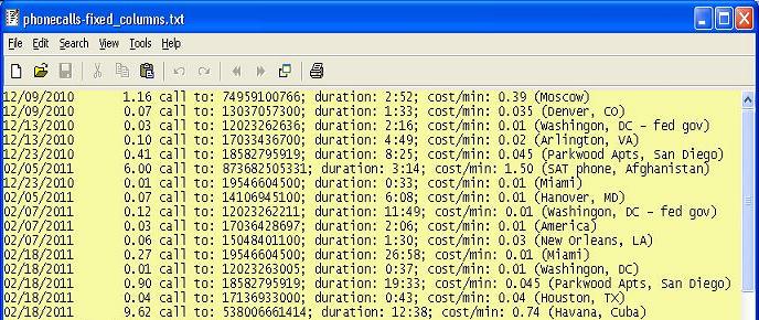 (Note: the files referred to In the following discussion can be found in the downloadable zip file in the SAMPLES area of the web site.) The data that we are interested in, the yellow block of the excel spreadsheet ("PHONE_BILL.xls") is cut and pasted (manually, or perhaps via some program) into a text file ("phonecalls-fixed_columns.txt"). This data will be the input for the program: